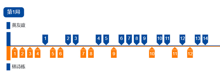 第一局开场石头4-0领先黄友政,随后6-1继续领先,黄友政追到3-7,林诗栋8-4继续领先,林诗栋9-5后连续丢分被黄友政9-9追平,林诗栋10-9先拿局点的情况下却连续丢分,最终黄友政14-12逆转。